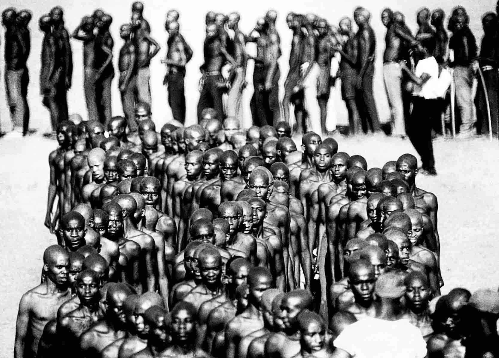 Grazie a un teleobbiettivo, Romano Cagnoni, Schiaccia e comprime queste reclute, facendone un unica massa di individui che quasi perdono la loro individualità, per divenire impersonali ingranaggi della macchina della guerra.